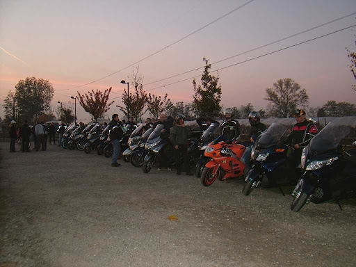 Foto di rito con i vari gruppi e il gruppone e panoramica dei mezzi parcheggiati in bell’ordine e in fila.