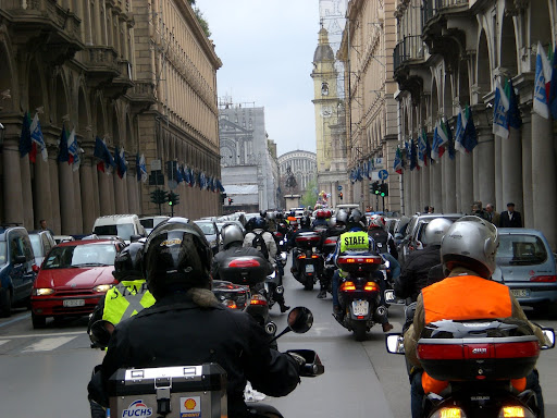 Bene Conclusosi il raduno delle terre sabaude fino alla Borgata Pardiso dove siamo stati accolti straordinariamente, da gente straordinaria. Due giorni che mi ricordano come generis la Val Cavallina. Il raduno e stato confezionato alla grande, la squadra piemontese a dato i suoi frutti in una due giorni davvero completa cultura, in giro per le campagne del piemonte e la grande festa della Borgata Paradiso di cui siamo stati parte integrante! Per chi non c'era ve ne racconto alcune fasi: Arrivo alle nove nella piazza del comune di Settimo torinese e gia una bel po' di amici e Burgman, schierati nella piazza ad attenderci saluti e baci, iscrizione al raduno, e poi il solito cazzeggio nell'attesa di partire per il tour, foto di gruppo i complimenti per la "Perla Nera". Scorgo Skiwalker che non vedevo dal tempo del MiMa, due chiacchiere anche con loro nel frattempo arrivano anche gli utlimi e si parte! Partenza per Torino dove vistiamo il parco del Valentino noi restiamo a far due chicchiere vicino ai Burgman parcheggiati davanti ad una bellissima fontana mentre il resto del gruppo visita il borgo medioevale sito nel Valentino. Si riparte per la tenuta di caccia di stupinigi sotto un sole che ci accompagna nel tour in barba alle previsioni del tempo. Qui ci si ferma per una colazione la sacco con la solita familiarizzazione con i nuovi presenti al tour foto di rito cazzeggio al bar con caffe e grappotti vari... potete ammirare le foto dei tre trichechi spiaggiati di front al bar... Si riparte per la residenza estiva dei savoia la famosa Racconigi dove le ciconge svolazzano soprala residenza e sulle nostre teste.. uno spettacolo davvero emozionante... Mentre noi ci rechiamo al bar per un gelato e un altro caffe' facciamo chiacchiere di ogni tipo... e gli altri visitano con la guida l'interno. Si riparte per il rientro nel albergo per la presa delle stanze e un attimo di relax. Ci si ritrova alla festa della borgata paradiso dove ceneremo il tempo si mette al brutto e i lombardi tranne me che ero da giggi si cuccano un acquazzone di pochi km ma intenso... Finalmente si entra sotto i tendoni della festa e cominciano le libagioni, qui tra una burla e l'altra, tra un pietanza e l'altra si arriva al caffe' e il magico maverick estrae la magica Boccia contenete i famosi zuccherini che diventeranno ben presto il lif motiv della borgata paradiso praticamente un via vai verso la boccia di tutti i presenti alla festa... solo i musicisti perche suonavano lontano dai tavoli non ne hanno approfittato! Siamo arrivati alla mezzanotte c'e' chi vorrebbe restare a cazzeggiare ancora un pò, e chi invece vuol rientrare, stanchi della levataccia mattutina e sapendo che si saremmo svegliati da li a poco per il giro della domenica: Ore nove colazione alla borgata, riuniti gli equipaggi si parte per il tour della città di Torino nel frattempo è arrivato anche il bistecca. Giro per la città, al passaggio della colonna c'e' chi si ferma a fotografarci stupito con il telefonino, prima tappa gran Madre e sosta in piazza della foto di rito e via subito per la piazza Castello, altra sosta e poi su per Soperga dove abbiamo rubato la scena per un oretta al raduno della Ducati, visita al cattedrale e il luogo dove è caduto l'aereo del grande Torino. Si rannuvola con qualche goccia d'acqua che ci accompagna in borgata dove si pranza si cazzeggia e ci si da alla lotteria e si passa alla consegna delle targhe del club alle autorità e agli sponsor della giornata! la lotteria come sempre uno spasso i soliti forunati tipo guma e maverick, si sono spartiti il bottino... tacci loro.. che Il tempo si mette al brutto decidiamo di partire il mitico Balalf detto dr. House si incammina e subito dopo anche noi... si parte salutiamo gli amici piemontesi con nessuna voglia di andare via... ci incamminiamo sotto la pioggia che c ci lascera appena usciti da rondissone.. per arrivare a milano senza intoppi... UN WEEK END proprio bello grazie a tutti i BULL RIDERS per averci fatto stare bene !!! Alla prossima avventura... qui le prime foto http://picasaweb.google.it/santinorimarco7/VnvuEH